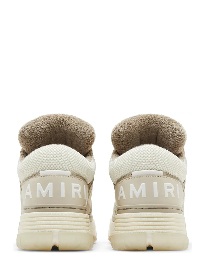 De MA-1 sneaker in albastberk vormt het hart van de AMIRI-collectie en combineert vakkundig hoogwaardige materialen met een verfijnd design. Het ademende mesh en het duurzame leren bovenwerk zorgen voor optimaal comfort en een lange levensduur, terwijl de dubbele vetersluiting zorgt voor een veilige, aanpasbare pasvorm. De doorschijnende rubberen buitenzool biedt betrouwbare grip, aangevuld met het reliëf MA-logo op de zijwanden voor een subtiel, kenmerkend detail. Geperforeerde steraccenten verbeteren het ademend vermogen en voegen een onderscheidende touch toe, waardoor deze sneakers een verfijnde maar functionele aanvulling zijn op elke garderobe.