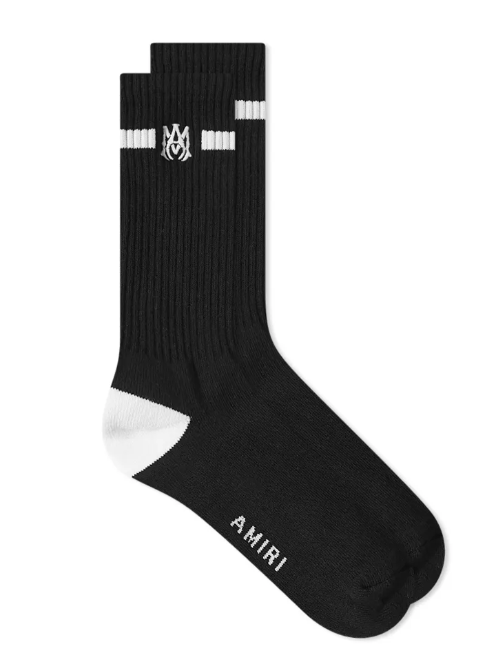 De Amiri MA Embroidery Socks in zwart, gemaakt van 100% katoen, combineren comfort en stijl met een verfijnde streetwear-uitstraling. Deze enkelhoge sokken zijn voorzien van het iconische AMIRI-logo op de zijkant geborduurd, een subtiele maar onderscheidende knipoog naar de rock-'n-roll-traditie van het merk. Perfect ontworpen om boven je sneakers uit te steken, complementeren ze de lage sneakers van AMIRI voor een samenhangende, urban-geïnspireerde look. Deze sokken zijn duurzaam en ademend en vormen een essentiële basis voor elke moderne garderobe die op zoek is naar moeiteloze coolheid.