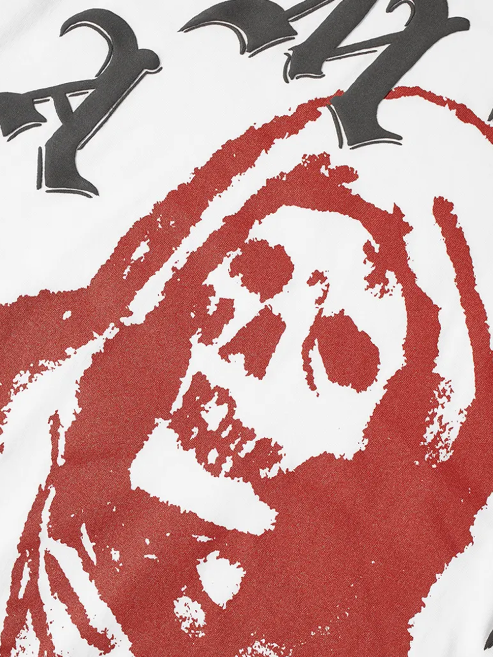 Het Amiri Wes Lang T-shirt in het wit combineert high-end mode met opvallende gothic artisticiteit. Gemaakt van 100% katoen, biedt dit T-shirt met ronde hals superieur comfort en duurzaamheid. Met Wes Langs kenmerkende Grim Reaper-motief onder het iconische AMIRI-logo, geeft het een onderscheidende, artistieke touch die de unieke samenwerking tussen twee LA-legendes weerspiegelt. Perfect voor wie houdt van gedurfd, eigentijds design met een mysterieuze flair.